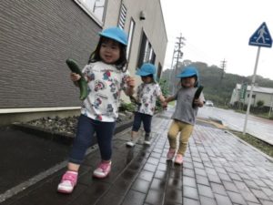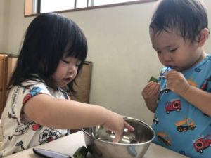 「かみなりどんがやってきた~♪ドンドコドン、かくすのは~おへそ!!」と歌い出すと子どもたちが周りにやって来ました。もう一度同じように歌ってみると・・・一生懸命おへそを探している子どもたち。そんな姿がなんとも可愛らしくてたまりません。別の体の部分に変えて歌ってみました。「かくすのは~♪お耳!」すると・・・耳を隠しています。目や耳、口、鼻など体の部分を理解しているようです。お休み中に色付いたトマトを収穫しようとビニール袋を保育士が手にしていると「いくー!」っと意気込んでいます。何処へ行くとも、何をするとも話してはいないのですが・・・子どもたちは靴と帽子を手にしています。準備ができた子どもたちと一緒に夏野菜の収穫へ。トマトのプランターの前に行くと「うわぁ~!いっぱいできてる~」「きいろのトマトもおいしいんだよ」「あかいのもあるよね」と、収穫が始まりました。次々と収穫をし袋の中がいっぱいになっていきます。トマトを取り終え、きゅうりの苗の様子も見に行く事にしてみました。見に行ってみると・・・なんと!なんと!大きなきゅうりが3本も実っているではありませんか。きゅうりの収穫は初めての子どもたち。さてどうするのだろう?とハサミを1本渡してみました。2歳児の子が葉っぱをかき分け、かき分け・・・チョッキン!きゅうりを1本収穫する事が出来ました。すると・・・それを見ていた周りの友だちもとりたい!となり、みんなで協力して収穫。オクラも大きくなっており今日は豊作です。大きくなりすぎてしまったオクラを子どもたちの前で半分に切ってみると・・・「なんか入ってる・・・。」と、言った2歳児の子がいました。中に入っている物を保育士が出していると「やりたい!」興味が湧いたようです。子どもたちにオクラを渡すと一生懸命中からオクラの種を取り出していました。その真剣なこと。採れた種をボウルに入れ混ぜ混ぜ。まるでお料理をしているかのようでした。みんなで採った野菜は塩とごま油で味付けをし、試食。「おいし~!」「もっとちょうだ~い!」と子どもたちの手が次々と伸びてきます。残りは給食と一緒にみんなで美味しく頂きました。