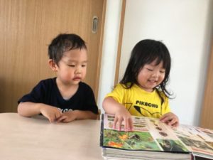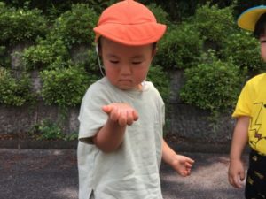 園庭で遊んでいる中、フェンス越しにどんどんと伸びてきているトマトの苗を発見。緑色のミニトマトを観察しながら「あかくなってからだね~」とお友だちに伝える声が聞こえてきます。昨日、沢山のミニトマトを食べ野菜への興味は膨らんできているようです。そんな様子からお部屋では、野菜に関する写真カードを準備してみる事にしました。お外から戻って来た子どもたちが早速手に取ると「トマト!」「きゅうり!」と写真カードを見ながら、次々に名前が出てきます。そこへ、昨日収穫した成長しすぎて食べられない特大きゅうりを置いてみると・・・突然出てきた本物のきゅうりにみんな興味津々。ツンツンと触れてみたり、サランラップを取ると大きなきゅうりを持ち上げてみたりして観察しています。更に、まな板に見立てた小さなかまぼこの板の上に特大きゅうりをのせ、おもちゃの包丁を手に取ると「ちょきん!」と素早くトントン!と昨日のクッキングを思い出したかのようにきゅうりを切ろうと真剣です。しかし、おもちゃの包丁ではなかなか切れず苦戦している様子。そこで本物の子ども用の包丁とまな板を準備してみました。「やりたい!」と初の包丁に挑戦です。恐る恐る包丁を手に取り、きゅうりをちょきん!おもちゃの包丁を使ったり、クッキングで保育士の様子を見ていた事もあり、「ててあぶないよ!」「きれたらきゅうきゅうしゃ!」と包丁が危ない事は分かっているようです。何度も切る中で、段々と慣れてきたようで特大きゅうりもあっという間に切り終わっていました。子どもたちが切った沢山のきゅうり。今回は食べられないという事で絵の具も準備してみるとスタンプのように紙にポンッ!と何回も押しながら野菜スタンプ遊びを楽しんでいました。