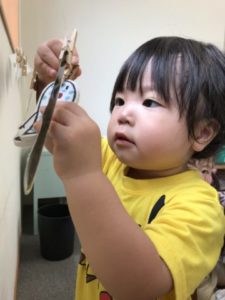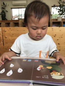 待ちに待ったきゅうりが大きくなり収穫の時期を迎えています。きゅうりを収穫しに行こうと袋とハサミを保育士が持っていると「いくー!」と。子どもたちは意気込んでいます。きゅうりが実っている所へ足を運ぶと・・・子どもたちは葉っぱをかき分け、かき分け、きゅうりを探しています。緑色のきゅうりは葉っぱに紛れ、なかなか発見しづらいのです。しかし、子どもたちは一生懸命探しています。見つけると「あったー!!」「きゅうり、ここにあったよ、みてー!」っと見つけた2歳児の子がお友だちにも教えてあげていました。ハサミを渡すと茎の部分を力いっぱい切って行くのですが・・・これが硬くてなかなか切れないのです。しかし子どもたちは食べたい一心で頑張っています。すると・・・子どもたちの頑張りできゅうりを2本収穫する事が出来ました。きゅうりを手にお部屋へと戻るときゅうりの写真カードや他の野菜のが沢山載っているイラストの隣にきゅうりを並べ「きゅうり、いっしょだね~」「おっきいね」などと、お友だちと楽しそうに話をしていました。収穫をしたきゅうりは給食の先生に渡し、綺麗に洗っていただきます。洗って頂いたきゅうりを手にしていると・・・子どもたちは直ぐに察した様子。みんな手を洗いに行き、消毒を済ませています。お友だちにも消毒液を「はい、どうぞ」と手渡したり、ポンプ式の消毒液を手の平に出してあげたりと子どもたち同士の素敵な関わりも見られました。きゅうりを切って行くと子どもたちの手が次々と机の上に伸びてきます。「たべたい!」「ちょうだい!」と。採れたてのきゅうりを試食。これも美味しいのですが・・・やっぱり味付けをしたきゅうりは格別の様で2本のきゅうりはあっという間に無くなってしまいました。別の場所ではおばけの絵本に夢中になっています。そんな姿におばけのイラストを出してみると、いつも掲示物がある場所へ2歳児の子が「パッチン!」と言いながらクリップに挟んでいました。おばけのイラストを描いてみると・・・「おめめない!」と目を書き足していました。沢山の目があるおばけ。そこから「はしゃみ(はさみ)ちょうだい!」と遊びを展開させていきます。おばけのイラストを器用に切り抜き楽しんでいました。小さいお友だちはシール貼りに真剣です。指先を器用に使い台紙から剥がそうと一生懸命な姿がとっても印象的でした。ちなみに今日もきゅうりを全部食べて無くなると「もっとないの?」「もっとたべたい」「さがしにいこっ!」っときゅうりは大盛況なのです。「はやくできないかなぁ~、きゅうり」と、待ち遠しい様でした。