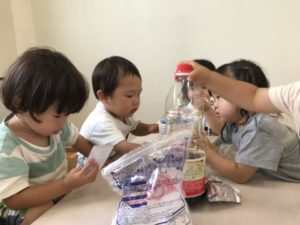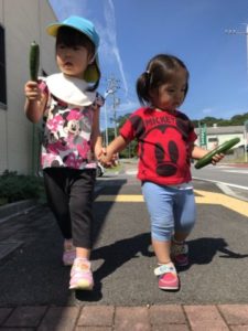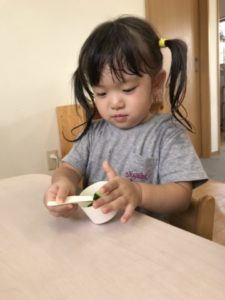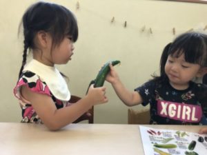 次々と実るきゅうり。今日も2本出来ていました。収穫すると大事そうにきゅうりを持ってお部屋へ。採ってきたきゅうりをお友だちにも見せていました。採れたてのきゅうりはチクチクととげのような物が生えています。手に刺さったりはしないのですがチクチクしていて、手に持った子から「チクチクしてるね」なんて声が聞こえ、採れたてならではの感触を味わうことが出来ました。きゅうりの頭とお尻の部分を切り落とすと子どもたちは「ちょうだい!」と。切った部分を渡すと匂いを嗅ぎ「いいにおい」「きゅうりのにおいがする」と話しています。チクチクした感触や匂いと、子どもたちは色々な事を発見したようです。さて、今日の味付けは・・・。子どもたちが自分で選べるよう準備をしてみました。塩、ごま油、砂糖、醤油、和風だし。さて子どもたちはどの調味料を選ぶのでしょうか?調味料の名前も少しずつ覚えてきた様で「これ、これがいい、しお」「ごまあるら(ごま油)としお」「しょうゆとさとう」色々な調味料を選んでいきます。子どもたちが選んだ調味料をきゅうりに掛けると「ん~!おいしい!」「もっとちょうだい」「もうないの?きゅうり」「もっとたべたいなぁ~」きゅうりは大盛況。子どもたちの想いにきゅうりが答えてくれています。きっとお休み明けにもきゅうりが採れそうな予感・・・。楽しみです。ちなみに調味料人気No.1は塩でした。