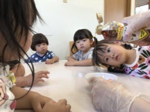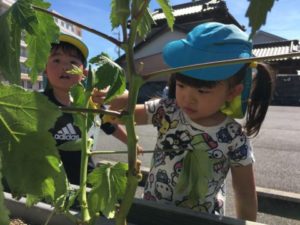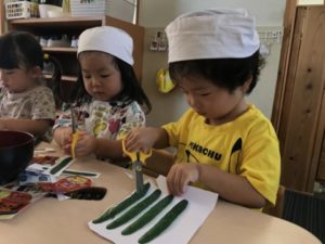 土日のお休みの間も保育園の野菜たちは次々にたくさん実をつけている様子。プランターを眺めながら「あ!あかいよ!」と赤くなったトマトを発見したり、更にはオクラまで。少し歩くと、別の場所では沢山のきゅうりも!袋を手にみんなで収穫です。収穫後、給食の先生にきれいに洗って貰うと、今日もクッキングの始まりです。何も切っていないきゅうりとトマトを机に置き、調味料をかけようとしていると・・・「あ!ちがうよ」「だめ!」と子どもたちからの声が。「トマトきらないとだめでしょ!」「ちょっきんするの!」と何度もクッキングをやっている事もあり、クッキングの工程を覚えてきているようです。子どもたちの声からトマトを切り、今日は中華風に味付けをしてみました。いつもと違う味に「おいしい~」「もっと!」とやめられないとまらない!何度も味見をしながら美味しそうに食べていました。トマトを完食した後はみんなが大好きなきゅうりです。今日はいいつもと違う切り方をして子どもたちの反応をみてみたいなぁと思い、蛇腹にきゅうりを切ってみる事に。切り終わったきゅうりを早速手に取ってみると、長く伸びるきゅうりにびっくり!「へびみたい!」「こわいよー」とくねくねと動くきゅうり釘付けな様子でした。きゅうりもトマトと同じように中華風に味付けをし、冷蔵庫で味を染みこませると完成!給食の時間にみんなで美味しく頂きました。