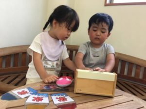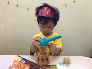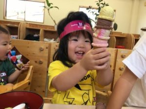 「わぁ~あいしゅ!(アイス)」と昨日から興味を示し始めているアイスクリームのおもちゃ。好きな味のアイスクリームを手に取ると、コーンの上に一生懸命いくつも積み上げ楽しんでいます。「○○ちゃんはピンクにするの」とよく似た色合いのアイスクリームを積み上げてみたり、メニュー表を片手に「どれにしますか?」とお店屋さんになりきりながらとっても楽しそうです。そんな姿から、アイスクリーム屋さんの帽子を作り準備してみる事にしました。おもちゃの隣にそっと置いてみると、早速装着!ニコッと嬉しそうに再びアイスクリーム積みに挑戦!「おちる~!!」と言いながら無事積み上げたアイスクリームを持つことが出来ると、ペロッと食べる真似をしニコニコとっても素敵な笑顔。更にボウルや泡だて器・レジスターやお金などのアイテムも置いてみたらどう遊びが展開されていくのかなぁ・・・と思い準備してみると、子どもたちの目はキラキラ!それぞれ好きなアイテムを取りワクワクした表情で遊び再開!ボウルにアイスを入れ混ぜてみたり、いくつものアイスをお皿に並べてみたりとその様子はまるでアイスクリームの屋さん。カタカタとおもちゃの音が鳴り響き、アイスクリームに遊びに夢中になる子どもたちでした。