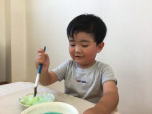 一方別の場所では、アイスクリームと同様密かに気になり始めているかき氷から、氷とある物を準備してみる事にしました。トレーに入った氷を見つめながらなにやらヒソヒソ話。「あれ!あれするの」と何かを発見し呟いています。そばまで見に来ると、そこにはかき氷機が。「ここ、いれるの」と以前氷を削った事を思い出したのでしょうか、「いれて!こおり!」と伝えてくれます。そんな声を見逃してはと、早速かき氷機に氷を入れレバーを回すと次々に出てくるふわふわな氷!「わぁ~~」ととっても嬉しそう。さらにかき氷の雰囲気を味わおうと、絵の具を準備。絵の具を筆で取り、氷にちょんっとつけるとみるみる広がっていく色を嬉しそうに眺めたり「つめたっ!」「こおりなくなっちゃったの」「どこにいったの?」と回りを見渡し氷を探すお友だち。沢山氷に触れ涼しげな1日でした。