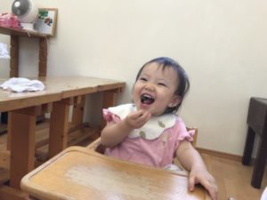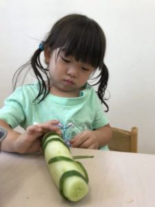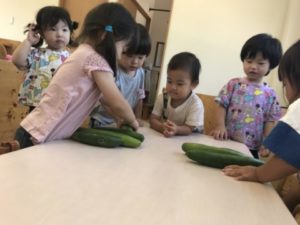 長いお休みを過ごし、子どもたちの元気な声と可愛い笑顔が園に戻って来ました。子どもたちの元気な姿を見る事が出来、嬉しい限りです!さて、長いお休み中に大きくなったきゅうり。早速、収穫に出掛けることにしました。遠くからでも大きなきゅうりの姿が見えるくらいジャンボサイズに成長しています。大きなきゅうりが沢山実っていて子どもたちは大喜び。みんなで協力して収穫をしていきます。2歳児の子が次々と収穫をしてくれていました。1歳児の子が収穫出来なくて困っていると・・・2歳児の子が「〇〇がとってあげる!」と。代わりに収穫をしてくれ、採れたきゅうりを「はい!どうぞ!!」と渡してあげていました。なんと・・・なんと・・・今日、収穫出来たきゅうりはなんと9本。その中には大きくなりすぎてしまったきゅうり。子どもたち用に包丁とまな板を準備してみました。すると・・・それはそれは慎重に切っています。「あむないよ(あぶないよ)」なんて声も聞こえて来ました。子どもたちは包丁が危険な物だと知っているようです。輪切りにしたきゅうりを鼻に近づけ「いいにおいするよ」「きゅうりの匂いする」と。1本のきゅうりをピーラーを使い、全部皮を剥いてみました。その皮をシマシマ模様のように巻き付けている子もいました。自分たちで切った輪切りのきゅうりをジーッと見て「タイヤ!」ときゅうりの断面からタイヤを想像した2歳児。子どもたちの声を聞いていると「へ~、なるほど~!」っと思う事が沢山あります。包丁をも「あぶないから!」と止めるのではなく「やってみたい!」と言う子どもたちの気持ちを大切にしたいな、と思います。もちろん包丁は危険な物なので十分に安全を確保し、傍で見守りながら子どもたちの可能性を信じていきたいと思います。