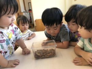 登園し、朝の用意を終えた子どもたちの日課、カブトムシやクワガタムシの様子を飼育ケース越しに先ず観察。しかし・・・姿が見えません。すると子どもたちは「くわたさん、いない」「お~い!くわたさ~ん」と飼育ケースに向かって呼んでいます。ケースの蓋を開けてあげると中を覗き込んでいるのですが一向に姿を見せる気配はありません。くわたさん(クワガタムシ)には少しかわいそうなのですが・・・砂の中から出し、子どもたちから見えるようにしてみたのです。しかし・・・直ぐにまた砂の中へと姿を隠していきます。そんな様子に子どもたちはとても残念そう。トレーに出してみたら・・・と、トレーの中に出してみると「くわたさん(クワガタムシ)、けんかするよ」「けんかはダメだよね~」と傍にいた友だちと話しています。くわたさん(クワガタムシ)の飼育ケースの中は砂ではなく木くずだったので、砂に変えてあげよう!と、くわたさんのお引っ越し。飼育ケースから木くずを出し飼育用の砂を入れていきます。砂を入れ、その後は子どもたちにお任せしてみました。クワガタムシのゼリーを用意していなくて困っていると・・・2歳児の子が「くわたさん(クワガタムシ)のゼリーちょうだい!」と保育士の所へ伝えに行っていました。ゼリーの蓋を開けるのも、トレーの中にいるくわたさんを飼育ケースの中へ戻してあげるのも子どもたち。くわたさんを手で触れるのはちょっと・・・。と言うような表情。プラスチック製のスプーンを用意するとそれを使い、無事飼育ケースの中へ。新築のお家を気に入った様子のくわたさん(クワガタムシ)。早速、土の中へと潜っていってしまいました。みんなが寝ている間に起きていた子は葉っぱを背中にまるでヤドカリのような貴重な姿のくわたさん(クワガタムシ)を見る事が出来たのです。「はっぱ、かぶってるね~」と言いながら飼育ケースの中を観察していました。