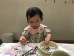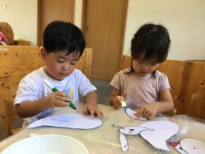 絵本を見終えてた後は、おばけに関するアイテムをいくつか準備してみる事にしました。「くろにする!」「○○ちゃんはピンク!」と好きな色を選びおばけの形をした紙に色をのせます。シールを貼ったり、はさみで切ったりと沢山のおばけが完成していきます。おばけ作りに夢中になりながら子どもたちは様々な物に興味を示しているようです。「これなにいろ?」「あかだね~」と色に興味を示す子、「まあるいおばけだよ!」「これさんかく!」と形に興味を示す子。たくさんの物に興味を示し遊びを広げ展開していく子どもたちでした。