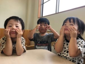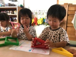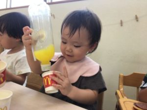 おもちゃ棚からハンバーガーのおもちゃを持って来ると、トレーの上に慎重に高く積み上げ始める子どもたち。野菜ばかり積み上げる子もいれば、バンズのみを積み上げるお友だちなど様々なハンバーガーが次々に出来上がっていきます。そんな様子からハンバーガー屋さんのメニュー表や写真カードを準備してみました。すると「あ!○○ちゃんこれたべたい!」「どれにする?」「ポテトたべたいの」と楽しそうな声が次々に聞こえてきます。更にはハンバーガー屋さんの帽子を被り気分はすっかりハンバーガー屋さんです。「いらっしゃいませ~」「どれにしますか?」とメニューを聞くと「ちょっとまっててね~」とバンズやレタス、チーズを積み上げ・・・完成!と思いきや「あれ?ジュースないの」とメニュー表の写真にはあったジュースがなく困っている様子。「うーんどうしよう」と考えこどもたち。そんな子どもたちを見ながら、こっそりこっそり別の場所で紙コップやストロー、色水が入ったペットボトルなどを置いて準備していると・・・その様子をしっかり目撃していた子どもたち。「あ!あった!」と嬉しそうにペットボトルを手に取り、紙コップを持っているお友だちのコップに注ぐ真似をし始めました。蓋をしている為、実際に水が出る事はないのですが、慎重にコップに入れようとする姿を見ていると本物のジュースが入っているかのように見えてきます。入れて貰ったジュースを一気にぐびっ!と飲む真似をするとおかわりを言う間もなく、何度も注がれていくジュース。注ぐ係りと飲む係と決まっているかのように、店員さんはぐるぐるとお友だちの周りをまわりながらジュースを注いでいました。無事ジュースも揃いハンバーガー屋さんは開店です。「これください!」「はいどうぞ~」とレジスターをピッと押しながら、積み上げたハンバーガーやポテト、ジュースを渡す店員さん。小さなハンバーガー屋さんは大盛り上がりでした。