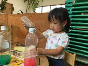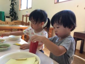 パンツトレーニングを始めているお友だちから「パンツかわいいの」「パンツはいてるよ」と嬉しそうな声が聞こえてきました。そんなお友だちの一言から「○○ちゃんパンツはいてる?」「せんせいもはいてるの?」とパンツのお話に夢中な様子。そこで”ねずみさんのパンツ”という絵本読んでみる事にしました。「これネズミさんのじゃない!」「○○ちゃんのパンツ!」となくなってしまったネズミさんのパンツを探すのに真剣。「あ!あったよ!」と無事絵本の最後にネズミさんのパンツが見つかると「オレンジのパンツあったね~」と嬉しそうでした。絵本を見終えた後は、大きな紙にカラフルなペンで保育士があるイラストを描いてみる事に。段々と出来上がっていくイラストの形に「パンツだー!」とうれしそうな笑顔。ピンク色のパンツやハートのパンツ、「キラキラパンツがいいの!」と子どもたちからのリクエストに答えながら紙いっぱいパンツが出来上がっていきます。更にパンツの隣に人型のイラスト。しかし「あれ?パンツはいてないよ」と大変パンツがありません。「これパンツないの」と言っていると、一人のお友だちが「○○ちゃんパンツかいてあげる!」とパンツ作りが始まりました。クレヨンやペン、シールを選び色をのせていきます。「ぱんちゅできた!」とカラフルなパンツが沢山完成しました。
