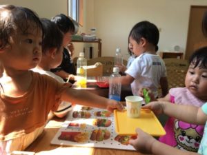 一方別の場所では、今日もハンバーガー作りに夢中な子どもたち。紙をはさみで細く切た物をポテトの容器に入れポテト作りをする子。ハンバーガーのバンズやレタスをトレーに並べ「ちーん!」と棚を電子レンジに見立てているのか何回も温める子。などなどそれぞれの遊び方でハンバーガー遊びを楽しんでいるようです。「これたべたいの!」「○○くんはポテトたべたい!」「かってきたらいいんじゃない?」と沢山の会話が聞こえ、盛り上がる小さなハンバーガー屋さんでした。