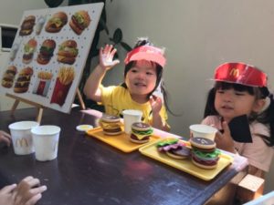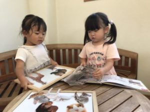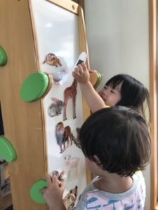 「おもしろめがねがうごきだす~♪」この手遊びで暫く盛り上がっていた今日。両手の親指と人差し指で丸を作り、めがねにしていると・・・「ちわう!!(ちがう)めがねちわうよ(ちがうよ)」と、子どもたちが教えてくれます。「めやね(めがね)かして~」「ピンクのめやね(めがね)がいい」「キラキラめやね(星型のめがね)ちょうだい!」と、めがねのリクエストが子どもたちから聞えて来ました。いつものおしゃれなめがねを用意してみると・・・好きなデザインや色のめがねを選んで掛けています。めがねを掛けると・・・鏡が見たくなる子どもたち。「かがみは?」っと言うので鏡も用意してみました。めがねを装着し、鏡を覗き込んでいる子どもたちの姿が何とも可愛らしくてたまらないのです。お友だちにも鏡を見せてあげ「にあってるよ」と、声を掛けてあげている子の姿も見られました。その姿がとっても微笑ましくステキな姿で思わず「パチリ!」と1枚。今までは自分だけの世界だった子どもたちが月日を重ね、友だちの存在に気が付き真似たり、時には一緒に遊んだりしている姿を見ていると、とても成長を感じます。机の上に置いてあった動物図鑑。子どもたちは興味深げに1ページずつ開き見入っています。知っている動物が出て来ると動物の名前を言ったり、知らない動物には「これなにかなぁ~?」っと考えたり。そんな子どもたちが見ている動物図鑑の隣に動物の写真カードを置いてみました。すると・・・同じ動物探しが始まったようです。動物の名前を知らないお友だちに「サイだよ」「これはゴリラさん」と、教えてあげていました。子どもたちは身近にいる犬や猫以外にも沢山の動物の名前を知っている子もいます。知っている子が教えてあげているステキな姿。このような姿に大人が関わり過ぎること無くそーっと見守っていきたいと思います。先週に引き続き、もちろんハンバーガーも大盛り上がりをみせていました。可愛いハンバーガー屋さんから「いらっしゃいませ~、どれがいいですか?」なんて聞こえてきました。子どもたちの世界は見ていてこちらが楽しく、ワクワクする展開ばかり。明日はどんな展開になり、どのような世界が広がるのでしょう。楽しみですね。
