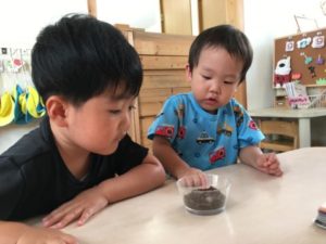 う、うごいてる~!カブトムシの幼虫・・・。