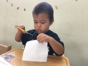 一方別の場所でははさみに夢中なお友だち。2歳のお友だちは連続切りに挑戦中。そんな様子を遠くから見ていた1歳のお友だちも「はーみ(はさみ)するの」「ちょきちょき!」とはさみに挑戦です。いろいろ考え刃先に紙を挟もうと真剣なお友だち。何度も何度もはさみを開けては紙を挟み・・・ちょきん!少しずつ紙が切れると嬉しそうな表情。真剣な眼差しではさみに向き合っていました。そんな様子から今日は、紙に加え段ボールやストローなど他の素材も準備してみたいなぁ、どうなるかなぁ・・・思いそっと置いてみる事に。子どもたちはよく見ています。早速手に取りいつもと違う感触に少し苦戦中。ぎゅっと力を入れ・・・ちょきんっ!更にはストローやモールなどなど。様々な素材を切ることに挑戦。はさみを夢中になって使う子どもたちでした。
