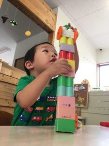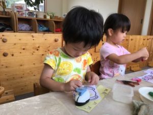 様々な形や木製の動物のおもちゃを机に並べて遊ぶ子どもたち。「これぞうさんだよ!」「これは?」「ワニさん!」「がぁおお!」と楽しそうな声がたくさん聞こえてきます。そこへ、動物の写真カードを準備してみると・・・「これいっしょ!」「おうちにライオンあるの」「これみたことあるの」と動物に夢中になってお友だちと話します。「どしーん!」「こんにちは~」と動物たちを動かしながらお友だちとやり取りをしてみたり、中には動物を器用にタワーのように積み上げてみたり、みんなそれぞれの遊び方で楽しんでいます。それならばと思い、様々な動物のイラストが描かれた紙やクレヨン、シールを準備してみる事に。早速手に取り、ダイナミックに好きな色で動物たちを色付けていきます。更には色々な形が出来る穴あけパンチやはさみなどのアイテムも追加してみると、子どもたちは真剣。紙をパンチに挟み、力強く押すと次々に出てくる星やハートの形!「これ!これ!ほし!」と嬉しそう。いくつも出来上がると、糊で動物のイラストにペタリ!動物が埋め尽くされるぐらいまで真剣に貼って「できた!」とついに完成したようです。完成した紙を手に持ち、「きらきら!これ!」と満足そうににっこり笑顔。「きらきらひかる~~」とキラキラになった像のイラストを眺めながら嬉しそうでした。