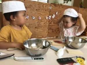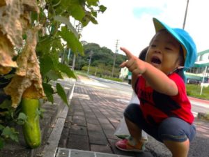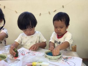一方別の場所では、プランターで子どもたちが収穫したオクラやきゅうりを準備してみました。大きくなり過ぎたきゅうりに、硬くなってしまったオクラ。何かに使えないかと、はさみでオクラを切ってみると「あ!タネでてきたよ!」と嬉しそうです。「これたべたいの」と一人のお友だちがいうと「ダメよ~ダメダメ!」と何とも面白い会話も聞こえてきます。更に、絵の具も一緒に置いてみると、野菜スタンプに大変身!紙にいくつもポンッ!と押しては「つぎきいろ!」「みずいろがいいの」と好きな色を混ぜ合わせながら、カラフルなオクラの形が紙一面に出来上がっていました。
