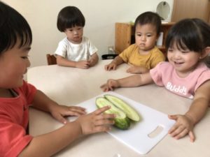 スタンプを終えた後は、きゅうりを切ってみる事に。大きくなり過ぎていた為残念ながら食べる事は出来ませんでしたが、包丁を手に取るとみんな真剣。慎重に慎重にきゅうりを細かく切りながら包丁に挑戦していました。