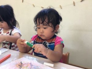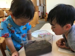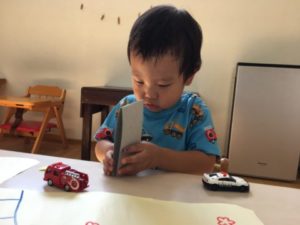 虫の図鑑や写真カードを机いっぱいに広げ「クワタさんだ!」「これカブトムシ!」と好きな虫の名前を次々に呟きながら何やら楽しそうな声が聞こえてきます。今日も虫に興味津々な子どもたち。棚の上に置いてある二つの虫かごを指さしながら「クワタさんいる?」と虫かごの中身が気になる様子。そんな子どもたちの声から、早速虫かごの蓋を開けてみますが・・・本日もどうやら土の中に潜り不在のようです。「クワタさんいないねー」「おきてー!!!」と何度も土に向かって言っていると・・・子どもたちの想いが届いたのでしょうか!土がもぞもぞと動き始めました。「あ!うごいた!」とひょっこりでてきたクワタさん!クワガタムシの姿が見えるととっても嬉しそうに「ゼリーたべる?」「クワタさんおきた!」と話しかけていました。すっかりクワタさんに夢中な子どもたち。今日は、カブトムシの仲間の写真を印刷し準備してみました。ヘラクレスオオカブトやニジイロクワガタ。普段見た事のない大きさや色の昆虫にみんな釘付けです。「これ!すきなの」「○○くんはこれ!」と図鑑や写真カードと睨めっこ。更に、クワガタムシのイラストを印刷した紙やクレヨン、シールなどのアイテムを置いてみる事に。早速好きな色のペンやクレヨンを手にクワガタムシに色をのせていきます。シールをいっぱい貼り付けたり、はさみで切ったりと沢山のカラフルなクワタさんができあがっていました。一方別の場所では乗り物にも夢中な子どもたち。乗り物のおもちゃに加え、紙やペン、シールなどを準備してみる事に。大きな紙に線路を描いたり厚紙でトンネルをつくると、その上を「ピーポーピーポー」「ウーウー!」と乗り物たちが走ります。そんな中一人のお友だちが「ぴっぴっ!はい、もしもしたいへんです!きゅうきゅうしゃきてください!」と何やら電話をしている様子。トンネルとして使っていた厚紙を半分に折り、見た目は立派な携帯に大変身!「ぴっ!はい!おねがいします!」と一生懸命通報していると、隣で遊んでいたお友だちも慌てて救急車を動かし「ピーポー!」。更に後ろには消防車が続き大忙しな乗り物たちでした。