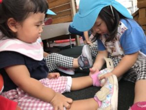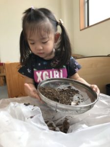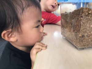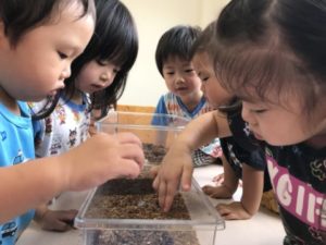 登園して、朝の準備を済ませると「カブトムシのあかちゃんは?」と、飼育ケースの中の幼虫が気になる様子。飼育ケースの蓋を開けても「あれ?」幼虫の姿は見えません。「ねんねしてるんだよ」「したにいる」「もういないのかなぁ?」っと様々な声が聞えて来ます。子どもたちは飼育ケースを上から覗き込んでいます。カブトムシの幼虫が昆虫マットを食べ沢山、糞をしています。黒い物を見て「これ、うんちじゃない?」「うんち、いっぱい!」子どもたちのこのような声に今日はカブトムシの幼虫のお家をお掃除をしてみる事にしました。先ずは幼虫をトレーの中へと引っ越し。沢山の幼虫に子どもたちは「うわぁ~、いっぱい!」「うごいてるよ!!」と、驚きを隠せないようです。幼虫を引っ越しさせ、保育士が土をふるいにかけていると・・・「やりたい!」「シャカシャカ、やる~!」っと言ってくれた子がいました。そんな子どもたちに任せてみると「これ!うんちじゃない?」「ポイッてする」とふるいの中の糞を袋の中に入れてくれています。ザルを使ってシャカシャカ・・・シャカシャカ・・・それを見た子どもたちは次々に「やりたい!」と意気込んでいました。綺麗になった土と新しい土を飼育ケースの中へ戻し、次は幼虫のお引っ越しをしなければなりません。トレーの中にいる幼虫・・・さて、どうやって飼育ケースの中へと引っ越しさせてくれるのでしょうか?子どもたちの様子を見てみる事にしました。すると・・・昆虫大好きな1歳児の子がそーっと手で持ち、飼育ケースの中へ入れてあげています。それを隣で見ていた、またまた1歳児の子が真似てそーっと触れています。すると・・・手に持ち飼育ケースの中へ引っ越しさせてくれていました。1人で触るのはちょっと怖いけど、お友だちも触っているなら平気になる。まるで魔法のようです。お友だちの姿を見て真似たり、やってみようとする姿を間近で見る事が出来、子どもたちの成長を感じます。友だちがやっているからやってみよう、このような姿がもっと増えていく事を期待し、子どもたちを見守っていきたいと思います。