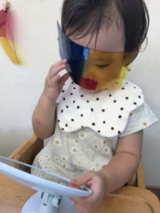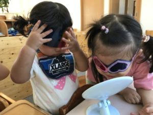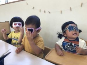 今日は子どもたちに見つからないようこっそり・・・メガネをいつも様々な物が掲示してある場所へ掲示をしてみました。掲示をしたメガネ。子どもたちに大人気のメガネでレンズ部分にはカラーセロハンが挟んであり、それをラミネートし、実際に掛ける事が出来るのです。このメガネ、定番のデザインからちょっと変わったデザインまで様々な種類を取りそろえているのですが、子どもたちにはそれぞれ好きなデザインや色があり、掲示場所から好みの物を選び掛けてみたり、顔に当ててみたりし楽しんでいました。すると・・・「ささみ(かがみ)みたい!」とリクエストがあったので鏡を用意するとメガネを掛け覗き込んでいます。メガネを掛けた自分の顔を鏡で見てニッコリ!隣でメガネを掛けていたお友だちにも鏡を見せてあげるとっても微笑ましい姿が見られました。2つのメガネを重ね合わせ「あ!みどりになった!」と、色の変化にも気がついた様です。お友だちとメガネを変えっこしたり「かして~!」「どうぞ!!」っとやり取り。そんな姿が可愛らしく、見ていてこちらが暖かい気持ちになります。メガネのイラストを机の上に置いてみると・・・沢山載っているメガネのイラストの中から好きなデザインを選び「はしゃみ(ハサミ)かして~」「ぬりぬりしたい」っと子どもたちから聞こえてきたリクエストの物を用意。メガネのイラストを器用に切り抜いている2歳児の傍で、ジーッと観察している1歳児の子。切り終わるまでジーッと隣で見ていました。切ったメガネのイラストを2歳児の子が「はいどうぞ!」っと渡してあげていました。メガネのイラストを貰った1歳児の子もとっても嬉しそうで、貰ったイラストに色を付けていました。ちょっとした仕掛けからこんなに沢山のステキな姿を見る事が出来ました。子どもたちの遊びや関わりを見ているとワクワクします。明日はどんな遊びが盛り上がるでしょう・・・。とっても楽しみですね。
