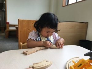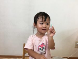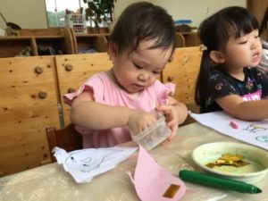 10月になりお部屋の飾りにハロウィンを加え秋仕様にしてみたことに子どもたちも気が付き始めている様子。「おばけだ~」と呟く声から、おばけに関するアイテムを準備してみたら・・・とおばけの写真カードを置いてみる事にしました。色々なカードが入ったケースの中から、おばけのカードを取り出していると子どもたちも興味津々。「なにこれ?」「あ!おばけだ!」とカードを手に取るとにっこり笑顔。「おばけさんこんにちは」「これおばけふうせんだよ」「あ!まあるいおばけ」と色々な形や色のおばけにワクワクしていました。更におばけに関する絵本も準備してみると「これがいいの」「○○ちゃんはおばけのかわ!」と子どもたちのリクエストから、”へんしんトンネル”や”おばけのかわをむいたら”という絵本を読んでみる事にしました。トンネルを通り抜けると、おばけに変身したり、おばけの皮を剥くと車やホットドックが出てきたり。何とも不思議な話にみんな釘付けになって見ていました。絵本を見た後は、おばけの形に切った紙やおばけのイラストが描かれた紙、クレヨンやシール等を準備してみる事に。「おばけかおないねー」と好きな色のペンやクレヨンを手に取ると紙にぬりぬり。中にはおばけいっぱいにシールを貼り付けているお友だちも。そんな中「あ!みてアイスあるよ」「これはぶどう!」とシールを貼る中で食べ物のシールを見つけた様子。どうするのだろう・・・とそっと傍で見ていると、おばけの手にペタリ!更にもう片方の手にもぺたり!「みてみて~おいしそうよ~」「たべてみる?」「ぱくっ!」「おいしいね~」とどうやらおばけさんに食べ物を食べさせているようです。「これもたべる?」とおばけを沢山の食べ物シールで埋め尽くし満足そうなお友だちでした。