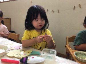 一方別の場所では、粘土を使いこっそり保育士がおばけを作っていました。遠くから見ていたお友だちも「やりたい!」と粘土やヘラ、麺棒を手に取り粘土遊びが始まりました。手のひらでコロコロと転がしてみたり、細長くすると「ようちゅう!」と幼虫を作ってみたり。中には、トレーいっぱいに小さくちぎった粘土をのせ、スプーンで掬うと「ごはんできたよ~」「はい、どうぞ」と立派なごはんに大変身!「おいしいね~」「もっとたべる?」と粘土遊びをしながら、お友だちとのやり取りを楽しむ子どもたちでした。
