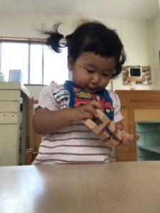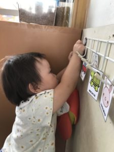 掲示してあるおばけを見つけ「はぼちゃ(かぼちゃ)のおばけだ!」「ほら、あそこにあるよ」と。おばけの人気は急上昇です。先週から続くおばけ人気。子どもたちの興味がどの様に広がっていくのか?楽しみになり、おばけに関するイラストや写真カード、絵本などを用意してみました。絵本を開き、絵本の中に描かれているおばけとおばけのイラストを見比べ「おばけ、いっしょー!!」と。目と口を切り抜いたかぼちゃのイラストを顔に当て「みえる~」っとのぞき込める事を喜び、友だちと覗き合いっこをしケラケラと笑い声が聞こえてきます。子どもたちの楽しそうな姿を見ているととっても嬉しくなります。絶賛、おばけに夢中のようです。絵本に出てくるおばけや初めて見る不思議なおばけを描いていると・・・子どもたちが集まってきました。子どもたちからどんな声が聞こえ、どのように遊びへと展開させていくのか?ちょっと仕掛けてみました。描いていたおばけを見て「めめがないじゃん!」「おきち(お口)もない!」「あれ?ててもない」子どもたちから様々な声が聞こえてきます。その場をそーっと離れ見ていると・・・子どもたちは「ぬりぬりしたい」「かきかきないの?」「はしゃみ(はさみ)ちょうだい!」と自分たちが使いたいアイテムをリクエスト。子どもたちのリクエストのあった物を用意すると、次々と遊びを展開させていきます。1枚の紙におばけのイラストが沢山描かれている物を机の上に置くと「〇〇はこのおばけがいい」「△△は?」と、どのおばけにするか?を相談中。さて、そこからどうなるのか?紙は1枚しかありません。暫く考えに考えていた子どもたち。どうしたのかと言うと・・・2歳児の子がハサミを使って器用に切り離していきます。欲しいイラストが切れると「はいどうぞ!」と渡していました。ケンカになるかも?と想像していたのですが・・・全くケンカになること無く、ステキな姿を見る事が出来たのです。考えに考えている子どもたち。そこへ大人が介入してしまうときっとこのようなステキな姿を見ることは出来なかったのでしょう。大人が関わり過ぎること無く、子どもたちの楽しい遊びの展開を大切に見守っていきたいと思います。