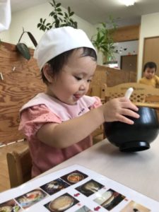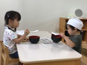 隣のコーナーではうどんやさんです。今日はレンゲだけを始めに置いておくことにしました。そのコーナーにきたお友だちの様子を見ていると・・・あまりピンとこなかったようでその場から去ってしまいました。次はお椀やボウルも用意してみると少し気付いたようで座って遊び始めましたよ。材料など前に置いておいたところそこから持って行きうどんやさんごっこがスタートです。「えびほしい!」や「はち(箸)ちょうだい!」など子どもたちの世界が広がっていました。遊びの中から聞こえてくる声がとても楽しみです。