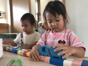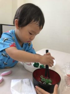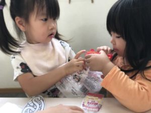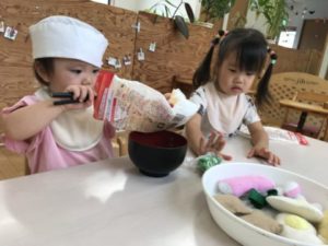 ここ最近のブーム、うどん。うどんの作り方工程表やうどんの写真カードを掲示しておくと・・・「あ!うろん!(うどん)」と気が付きメニュー表や作り方工程表を机に置き、子どもたちは頭を並べ見入っています。その姿が何だか会議の様で見ていてこちらが笑顔になれます。子どもたちの子ども会議。どんな話し合いが行われているのでしょう。ちょっと気になり耳を傾けてみると・・・「どれがすき?」「これがいい」「〇〇ちゃんは?」「かまご(たまご)はいってる」そんな話し合いが行われていました。暫く様子を見ていると「せんせー!せんせーはどれがいい?」と、メニュー表を片手にやって来ました。「ん~、どれにしようかな?」と迷っていると「これがいいよ」などとオススメしてくれたうどん。それはエビの天ぷらや卵、ネギなどが盛り沢山に入ったスペシャルなうどんでした。まさかオススメしてくれるとは思ってもみなかった展開。今までの自分の好きな物を伝える姿とは全く違い「どれがいい?」「これがいいよ」などと周りの意見を聞いたり、人にオススメまでしてくれる姿に成長を感じ、感動します。うどんの器と箸だけを机の上に並べて見ると・・・器の中を覗き込み「うろん(うどん)入ってないじゃん!」と。そんな声に白い毛糸を用意していると「あったー!!うろん(うどん)」「ちょうだーい!」次々と子どもたちの手が伸びてきます。器の中に毛糸を入れ「うろん(うどん)でーす!」「できましたよー!」と、展開させていきます。作り方工程表に載っていた写真の材料を棚の上に並べると「これ、いっしょー!!」塩のイラストを本物の塩と照らし合わせていました。そこから「ここにいれて~」とトレーを持ってきました。小麦粉のパッケージの中を覗き込み「ないじゃん!」と言う声もありました。塩や小麦粉をトレーの中に入れると「ん?」と言うような表情。工程表をじっくり見入って「おみじゅもいれる」次々と面白い声が聞えて来ます。全てを混ぜ合わせていくと、その工程を作り方工程表の中の物と同じである事を発見!「あ!」っと言う声と工程表を指差ししていました。今日はこのような展開になり子どもたちはそれぞれに楽しんでいました。