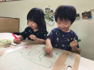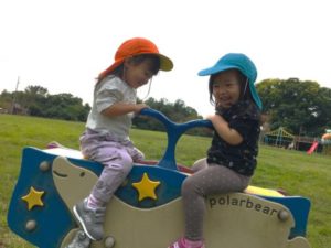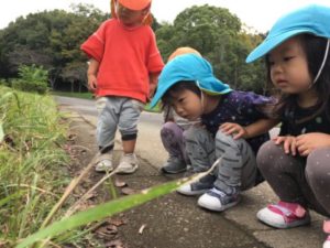 公園に到着すると、遠くに遊具を発見。「ここいく!」と行ってみると、滑り台や綱渡りなどなど魅力的な物がいっぱいです。元気いっぱい滑り台を何度も滑ったり、中には綱渡りに挑戦するお友だちの姿も。「こわいねー」と言いながらも慎重に慎重に綱を渡り終えると「できた!」と満足気な表情。その後も何度も挑戦していました。遊具で遊んでいると、「あ!どんぐり!」と沢山のどんぐりを見つけた様子。「ここにもあるよ」と気が付けばどんぐり集めに夢中な子どもたち。どんぐりの帽子を被せ「ぼうしできた!」「こっちはねんねしてるの」と大きなどんぐり帽子にすっぽりどんぐりを入れると、撫でながら大切にどんぐりを持っていました。