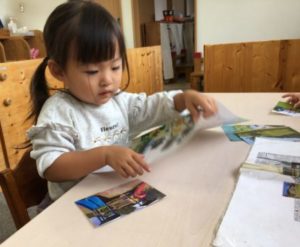 保育士がお散歩マップを手に持っていると「なに?」「これみたいの」と集まって来た子どもたち。マップを手に取ると、みんなで囲みながら「これどう?こことか!」「○○くんいっしょにこれのろ~」「ままとこれいったよ」と次々に楽しそうな声が聞こえてきます。園周辺の写真カードとマップを照らし合わせていると、「あ!きゅうきゅうしゃ!」「ここ!しょうぼうしゃ!」とみんな大好き消防署の写真を発見。「しょうぼうしゃみよか!」「さんぽいきたいの」とどうやら目的地が決まったようです。子どもたちの声からお散歩に出掛ける事にしました。帽子を被り、靴を履きお友だちと手を繋ぐと準備は万端です。歩き進めて行くと、道路には早速消防車や救急車が!「あ!きゅうきゅうしゃきたー!」「おうしょうしゃも!(消防車)」と近くで見る乗り物たちにみんな大興奮!みんなの思いが伝わったのか、消防士さんが手を振ってくれるととっても嬉しそうにみんなで手を振り見送っていました。