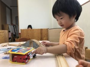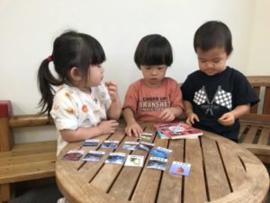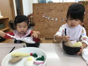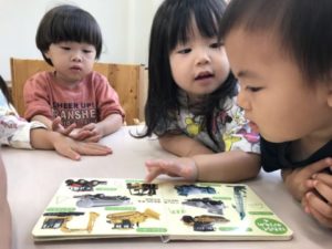 「ピーポー、ピーポー」とサイレンを鳴らしながら近づいてくる救急車をワクワクしながら待っている子どもたち。通り過ぎると何故か?みんなジャンプの連続。これ、毎年度子どもたちの姿が同じなのです。不思議だな~なんて思いながら子どもたちの様子を見守っています。救急車が見えなくなると子どもたちはササーッとその場所からいなくなるのです。子どもたちの興味はとってもわかりやすいですね。子どもたちのこのような姿から働く車のイラストや絵本、写真カードなどを用意してみました。好きな物を手に「ウ~、カンカンカン」「ピーポー、ピーポー」と言いながら机の上を走らせていました。別の場所では働く車が沢山載っている絵本を開き、友だちと見入っています。知らない車が出て来て「これなに?」と疑問に思った子がいました。そこへ働く車に詳しい子が「これはロードローラー」「これはね~、キャーカリア(カーキャリア)」と、教えてあげていました。言葉でのやり取りが増えて来て、子どもたちの会話を聞いていると成長を感じ嬉しくなります。別の場所では「ささし(おはし)でいれるの!」と、お箸の玩具を使い毛糸を器用に挟み、器の中へ。全部入れ終えると「うろん(うどん)できましたよー!」と。なんともいい匂いがしてきそうなくらい美味しそうなうどんが出来上がっていました。
