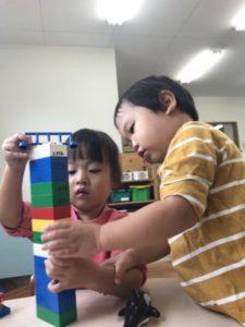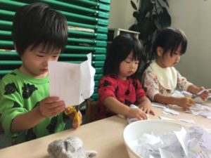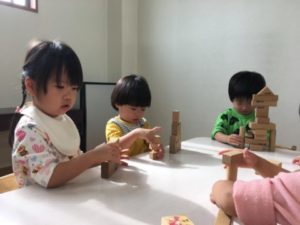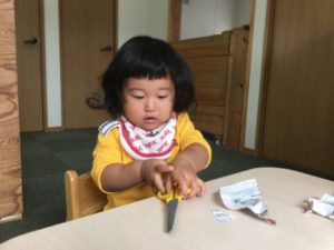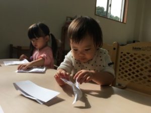 別の場所では、昨日に引き続き折り紙を準備してみる事にしました。机に並べられた複数の紙。早速手に取ると「ひこうきつくるの」「○○ちゃんはでんしゃ」と紙を三角や四角に折り始めていました。そんな姿を見ていた小さいお友だちも折り紙に挑戦。お友だちが折った物を広げじーっと観察してみたり、折っている姿を見ながら一生懸命真似をしてみたりと折り紙と向き合っていました。何度も折る中で、段々とくしゃくしゃになっていく紙。始めは、使い終わった紙を床に捨てたり、破いたりしていた子どもたちでしたが、こっそり何も言わずに隣で保育士が紙を広げていると・・・子どもたちも紙を伸ばし始めました!「こうするの」と再びくしゃくしゃになった紙も元通り!机に並べて置き、何度も繰り返し大切に使う姿が見られました。その後も「ちょきちょきしたいの」「ぬりぬりする」とはさみや糊を使い遊びを展開させていきます。はさみで細かく紙を切るお友だちもいれば、中には糊のケースを高く積み上げるお友だちなど遊び方は様々。何度も崩れては積み上げて・・・を繰り返し遊ぶお友だちの姿から、別の場所では積み木を置いてみる事に。すると、糊ケースの積み上げから積み木へと遊びは展開!初めは黙々とそれぞれが積み木を積み上げたり、時々お友だちと積み木の取り合いになってしまう事もありましたが、気付けば「いっしょにつくろ!」と一つの作品をお友だちと協力して作り上げる姿に!「こここうするの」「ここおいて!」と慎重に慎重に積み木を積み上げ・・・「できた!」と無事完成。机には大きな積み木のお城が出来上がっていました。