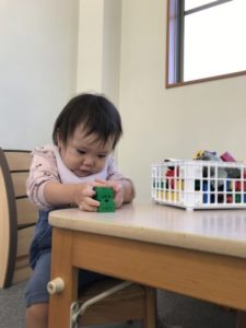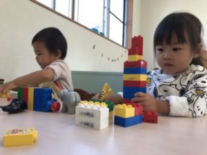 前日とは違う玩具に入れ替え、こっそりと棚の上に置いてみました。園庭から帰って来た子どもたちは玩具が変わっていることに気が付いた様です。「やったーー!」と嬉しそうに玩具を棚の上から机へと運んできて遊び始めています。ブロックを高ーく積み上げたり、ブロックの中に入っている赤と青の柵を高く積んだブロックの上に付け、面白いタワーが出来上がっていました。別の机には白い紙だけが・・・こどもたちはそれを見つけ暫く考え中・・・。「せんせー!」っと保育士の傍へとやって来た2歳児の姿がありました。「あのさ~、かきかきしたいの」「かきかきかして~!」っと伝えに来たようです。「かして~」っと伝えに来た子にお絵描きが出来るアイテムを渡してみました。すると・・・机に運んで行き、お絵描きが始まりました。じっくりと座って楽しんでいました。紐通しに挑戦していたお友だちは何度も紐に通し、遊び終えると今度は指にはめ「ガォーー!たべちゃうじょー!(たべちゃうぞー)」っと動物になりきっていました。今日もお部屋のあちら、こちらで面白い遊びを発明し、次々と展開させていく様子が沢山見られました。さて!明日はどんな遊びが盛り上がるでしょう?お楽しみに!