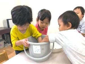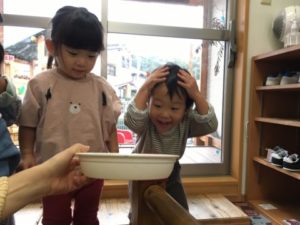 一方別の場所では、ラミネートしたさつまいものカードを片手に「トントントン!」と何やら料理をしている様子。「おいもたべたいの」「これきれないよ」とそんな声から、収穫時期を迎えたさつまいもを掘る事にしました。軍手を身に着け、スコップを手に取ると準備は万端です。中々抜けないさつまいもに苦戦しながらも力いっぱい引っ張ると・・・「おいもー!」と無事さつまいもを収穫する事ができました。その後も木箱いっぱいになるくらい沢山のさつまいもを無事収穫。採れたてのさつまいもを新聞紙とアルミホイルで包み、焼き芋にして美味しく頂きました。沢山のお芋たちが今後何に変身するのかとっても楽しみです。