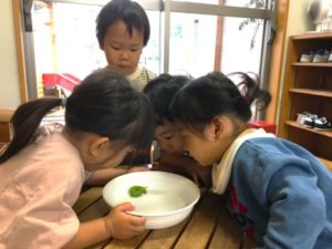 ブロックや積み木・絵本など好きな遊びに夢中になっていると、保育園に突然緑色のお客様がいらっしゃいました。緑色の正体はなんと大きな幼虫!5月から子どもたちが育てているさつまいもの葉をいっぱい食べ、大きくなった幼虫が保育園のゴミ箱までやってきたようです。そんな幼虫をトレーに入れ、子どもたちが見える所に置いてみると、「わぁ!きもちわるい!!」と突然現れた幼虫にビックリ仰天!頭を抱えながら「わぁ~~!うごいた!」と何とも可愛らしい姿も見られます。怖がりながらも、気になる幼虫。指でつんっと触れてみたり、中には掴んでみようと挑戦してみたりするお友だちも。「くるんってなったよ!」とひっくり返っても器用にくるっと元通りになる幼虫をじっくり観察したり、「これ!みどりー!」と色に注目して見てみたり、虫の図鑑を見ながら「これいっしょ!」「あった!」と幼虫と照らし合わせるな幼虫に夢中になる子どもたちでした。
