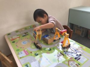 各机でのコーナーでは乗り物や電車の玩具を中心に用意してみました。自分で考えながらレールを繋げたり、道路がかかれているマットに好きな車などを走らせてみたり・・・ラミネートした働く車もそっと置いてみましたが今日はあまり興味がわかなかったようです。同じ玩具でも日々遊び方が違ってくるので今度はどんな遊びをするのだろう?と毎日楽しみにしています。
