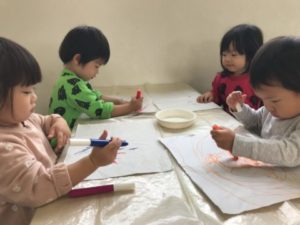 一方製作マットを敷いただけの机では「お絵描きしたい。」と声があがったので、紙とペンやクーピーを置いてみました。するとクーピーには目もくれずペンでお絵描きスタートです。描いた絵を指差しながら「さんかく!」「おいも!」などと教えてくれました。その後は別の紙を切って貼ったりなど自分たちで遊びを展開させて楽しんでいました。