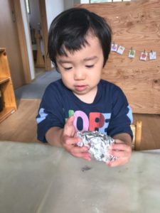 洗ったお芋に新聞紙とアルミホイルを巻きました。ギュギュッと・・・うまく巻けましたよ。
