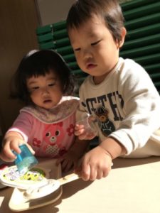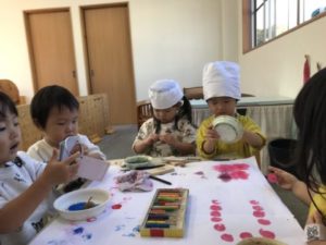 トレーに絵の具を出すと「みじゅ(お水)もいるじゃん!」と教えてくれる子もいました。子どもたちからリクエストのあった色をトレーに用意すると・・・半分に切ったさつまいもに色を付けていました。それを紙の上にポンポンと。スタンプ遊びが始まりました。クレパスや絵の具の好きな色を手にみんなとっても楽しそうでしたよ。