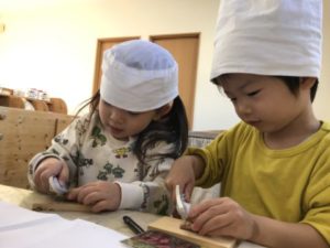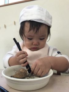 子どもたちが掘ったさつまいも。木箱に入れ棚の上に置いてあったので子どもたちからよく見えるよう机の上にさつまいもが入った木箱を降ろしてみました。木箱の中にはさつまいもがいっぱい!先日、自分たちで掘った事を思い出し「〇〇があっちのおそとでとったんだよ」「よいしょー!ってとれたの」と、話していました。箱の中のさつまいもに触れ「おもたっ!」「おっき~い」「ちっちゃいのもある」とさつまいもへの興味は広がるばかり。大きなさつまいもは再び木箱の中へ。そして小さくて食べられそうにないさつまいもをトレーの中に入れてみました。すると・・・手で切る真似っこが始まりました。「トントントン・・・」と言いながら。このような姿から玩具の包丁やまな板、和帽子なども準備すると、和帽子を被ってまるで割烹料理屋さん。玩具の包丁を手に小さなさつまいもを一生懸命切っていました。一生懸命切ろうとしているのですが・・・さすがに玩具の包丁では切る事は出来ません。子どもたちの目の前でさつまいもを実際に切ってみることにしました。子どもたちは興味深げに見入っています。子どもたちは半分に切ったさつまいもを手に取り断面を観察したり、匂いを嗅いでみたり・・・。「ん~!いいにおい!」なんていう子もいました。切ったさつまいもの断面を「しろになってる!」と。色のカードを準備すると・・・カードをペラペラとめくり「ぴんく、ピンクがいい!」色への興味も広がってきました。絵の具の入った箱を保育士が手に取ると「ぴんくほしい!」「あか!」子どもたちは自分の好きな色を伝えに来ます。