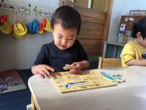 「パトカー!」「きゅうきゅうしゃ!」と乗り物の名前を呟きながらパズルに挑戦中。