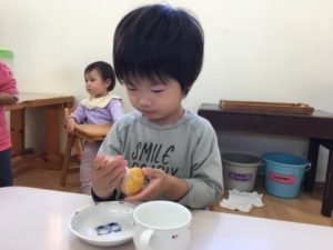 早速気が付いた子どもたち。急いで手を洗い、和帽子を身に着けると準備は万端です。「ここたべれないよ」と洗ったさつまいも皮をピーラーで剥くと、紫色だったさつまいもは鮮やかなオレンジ色のさつまいもに大変身!「オレンジだね~」と嬉しそうな様子。皮を手に取り観察してみたり、匂いを嗅いでみたり興味津々です。包丁で小さく切ったさつまいもを給食の先生に蒸して貰うとほくほくさつまいもの完成!更にお砂糖と牛乳を混ぜ合わせ、サランラップできゅっ!と絞ると、茶巾絞りの完成!完成したお芋にみんな目を輝かせながら一口パクリ!あまりの美味しさにあっという間に完食。「もっと!」「おかわり!」と大好評でした。