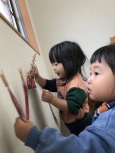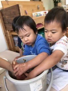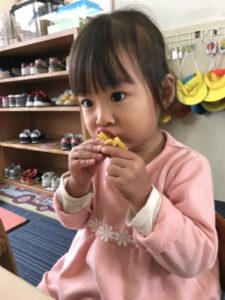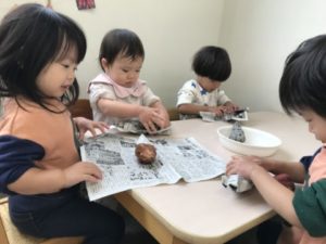 さつまいもに関する写真カードを掲示してあった場所から外し「おいも、たべたいね~」と。「おいもさんがね」という絵本を開き「おいしそうね~」っと子どもたちはここ数日、さつまいもにはまっています!ここ数日、自分たちで掘ったさつまいもを調理し味わったのがとっても美味しかったようです。今日も「たべたいね~」こんな声が聞こえて来ました。思わず「やきいも、やきいも、おなかがグ~♪」と歌い出す子もいます。このような姿に今日も焼き芋の準備を始めて見ました。バケツに水を入れ机の上に用意すると・・・子どもたちは腕まくりを始め、さつまいもをお水の中にジャブッ!っと入れ綺麗に洗ってくれています。洗えたさつまいもを新聞紙で巻き水で濡らしてからアルミホイルを巻いていくのですが・・・これも数日前に経験済み。経験していたからか?とってもスムーズに巻いていく子どもたち。さて、アルミホイルまで巻いたのですが・・・直ぐには食べられません。「これ、どうしよう?」と子どもたちに尋ねてみました。すると・・・少し膝をかがめ、左手の人差し指を1本立て「チ~ン!」「チ~ん!」っと言う1歳児の姿がありました。「チ~ン!ってするの?」もう一度尋ねてみると・・・「こーかーせんせい(きゅうしょくせんせい)あっち!」と給食室を指差ししていました。給食室の扉を開けてみると「はいどうぞ!」とアルミホイルで巻いたさつまいもを給食の先生に渡していました。暫くし出来上がったさつまいも。アルミホイルを子どもたちの目の前で開こうとすると「なんかにおいする」「あ!やきいも」「たべたい」と。アルミホイルを開き、さつまいもが見えてくると「たべたーい!」の連呼。甘くて美味しそうな焼き芋の香りがお部屋の中に充満していました。子どもたちの目の前でさつまいもを切っていくと・・・机の上には沢山の手が並んでいます。焼き芋を貰うとみんなとっても美味しそうに頬張っていました。もう美味しくて止まらない様子。「もっとちょうだい!」なんていう声が次々と聞こえて来ました。