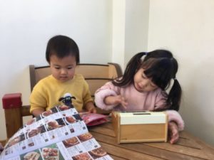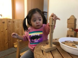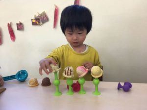 お部屋には積み木やブロック、吸盤やアイスクリームなど沢山のおもちゃでいっぱい。毎日おもちゃ棚から子どもたちはおもちゃを手に取り、それぞれが好きな遊びで楽しんでいます。沢山あるおもちゃの中でも、真っ先に手に取ったのがアイスクリームの吸盤のおもちゃ。初めは別々の場所でアイスクリーム屋さんごっこ遊びをしてみたり、吸盤を机にくっつけたりと遊んでいたのですが一人のお友だちが、アイスクリームを吸盤の所へ持っていくと・・・夢のコラボが!机にくっつけた吸盤の上にそっとアイスクリームを被せ、見た目はまるでアイスクリームのきのこ。二つしかなかったアイスクリームのコーンでしたが、気が付けば面白い形で遊びが広がり「みて!できた!」と次々にアイスクリームきのこが出来上がっていました。