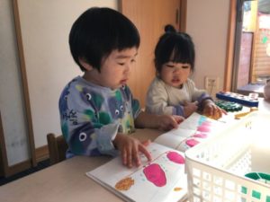 そんな中一人のお友だちから「パズルしたいの」とこんな声が聞こえてきました。子どもたちの声から早速、果物や乗り物・動物などのパズルを準備してみる事に。「やりたい!」とお友だちがやっている姿を見て小さいお友だちも一緒にパズルに挑戦。「これここ?」「ここちがうよ!」と教え合いながらパズルを完成させるうちに、「○○ちゃんこれみたことあるの」「あ!これきゅうきゅうしゃだよ」とパズルの絵柄にも興味を示し始めた様子。動物や乗り物のパズルを「とことこ~」「カンカンカン」と走らせてみたり、「これたべる?」と果物をあげてみたり。子どもたち同士で次々に遊びを展開させながらパズル遊びを楽しんでいました。