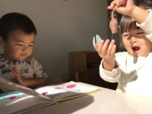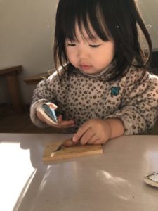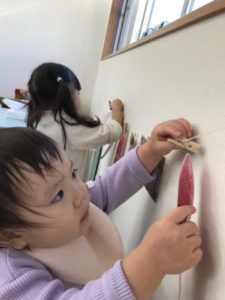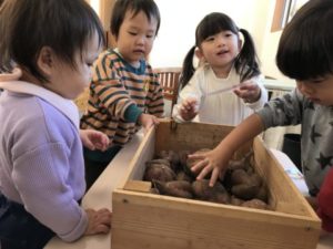 さつまいもに関する写真カードを見つけ、手に取り「おいも~、ほらみて~」っとお友だちに見せています。見せて貰った子が「やきいも、やきいも、おなかがグ~♪」と、やきいもの歌を歌い出していました。すると・・・周りにいた子どもたちも一緒になって歌い出し、大合唱。子どもたちが以前掘ったさつまいもが入った木箱を机の上に置いてみると木箱の中を覗き込み「うわぁ~!!やきいもだぁ」っと。さつまいもではなく焼き芋。「たべたいね~、やきいも」このような声も聞こえて来ました。先日、子どもたちと一緒に作ったやきいもがよほど印象的で美味しかったのでしょう。ここでちょっといたずら。子どもたちの目の前でそのままのさつまいもを食べようとしてみました。すると・・・子どもたちからは「ダメ、ダメ!チョキチョキしてから!」「おなかいたくなるよ」と教えてくれます。玩具の包丁やまな板を出してみると、さつまいもをまな板の上に乗せ、玩具の包丁で切る真似っこ。「ん~、かたい」「どうする?」子どもたちはどうしようか?考えていました。別の場所では掲示してあったさつまいもの写真カードに手を伸ばし、クリップから外しています。外したさつまいもの写真カードを再びクリップに挟もうと一生懸命。2歳児の子が傍へとやって来て「こうやってするんだよ」と、教えてあげていました。それをジーッと見て再び挑戦!!なんと・・・なんと・・・挟むことが出来たのです!このように子どもから子どもへ優しさの連鎖を見る事が出来、とても温かい気持ちになりました。子どもたちのこのようなステキな姿見られ嬉しい限りです!