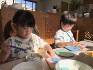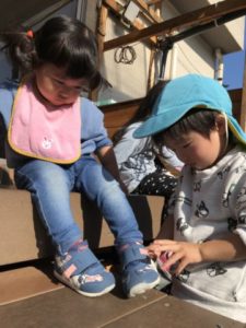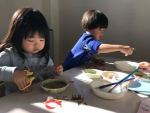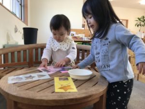 園庭から帰って来た子どもたち。掲示してあったサンタクロースのお面を見つけ「あんたさん(サンタさん)みて!」っと、お面をつけ友だちに見せに来ていました。お面をつけて見せてくれた友だちに誘われ、掲示してあったサンタクロースとトナカイの写真カードを持ってきて「あんたさん(サンタさん)いっしょ!」と見せ合いっこをしていました。保育士が絵本を手にしていると「なになに?みたい~!」っと傍へやって来ました。読んで見ると興味深げに見入っていました。別の場所では積木をしたり、ままごとの玩具を出し楽しんでいる子どもたちもいます。積木遊びをしている子どもたちから「さんかく~」「これ、しかくだよ」と形の名前が子どもたちから聞こえて来ました。子どもたちのこのような姿から形に関するアイテムも用意してみました。形のパズルなども出してみると「これはきらきら(星)」「あんかく(三角)」と言いながら2歳児の子と1歳児の子が協力しあいながらパズルをはめて楽しんでいました。クリスマスに関するアイテムを用意すると早速「はしゃみ(ハサミ)ちょうだーい」っとリクエストがありました。様々な素材のアイテムを切っています。毛糸を手にした2歳児の子はなんと・・・細かく、細かく毛糸を切り、まるで綿のようになっていました。綿のようになった毛糸を紙の上や四角に切った段ボールの上に貼り付けていました。色々な形の紙の上に毛糸やサンタさんのイラストを貼り付けたり、モールを付けたり・・・。声も発すること無く夢中になっていました。夢中になって出来上がったものは世界に1つだけのステキな飾りになりました。