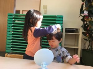 「あ!これする!」とお部屋に置いてあるおもちゃの中から手に取ったのは、ドーナツのおもちゃ。トレーいっぱいにドーナツを並べてみたり、お弁当箱に詰めてみたり。スプーンでかちゃかちゃと混ぜたりしながら楽しそうです。そんな姿を遠くから見ていたお友だちもドーナツ遊びに加わり「どれたべたい?」「これにする?」とドーナツのメニュー表を囲み楽しそうな声も聞こえてきます。お皿いっぱいにドーナツを盛りつけ「できた~」と嬉しそうにスプーンで掬うと「いただきます!」とぱくりっ!またまた「いただきます!」と一口食べる度に手を合わせながらドーナツを食べる真似をして楽しんでいました。