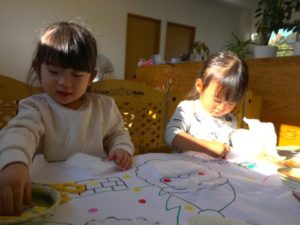 一方別の場所では、前回に引き続きクリスマスに興味を示し始めている子どもたち。サンタクロースやトナカイのお面を装着してなりきっている傍で、こっそり大きな紙いっぱいに保育士がサンタやクリスマスツリーのイラストを描いてみる事にしました。「あ!サンタさんだ!」「これはツリー?」と次々に描かれていくイラストに興味津々です。すると、「ここ!キラキラかいて」「こっちはピンク!」「ゆきだるまもほしいの」と子どもたちからのリクエストが聞こえてきました。子どもたちからの声から、ペンやクレヨンを置いてみると、早速色を塗ったり「みて!できた!」と雪だるまのような丸を描いてみたりとあっという間に、紙一面カラフルに!その後も、はさみを使い、毛糸や綿・紙・モールなどの素材を切って張り付け、素敵なサンタクロースやツリーが出来上がっていました。