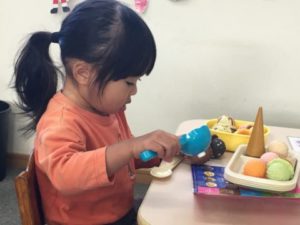 お部屋に入ると「ピカピカしてるね。」とクリスマスツリーを見てウキウキした様子の子どもたちです。机に置いてあったサンタクロースやトナカイのお面を顔に付けて、お友だちの前に行って驚かせて楽しむ姿が見られました。クリスマスの絵の紙を用意してみると「かきかきする!」の声が聞こえてきたので、ペンを出してみるとお絵描きが始まりました。たくさんの線を描いたり、サンタクロースやクリスマスツリーのイラストの星に上手に色を塗っていました。ケーキの絵を見ながら「フーー!」とろうそくの火を消す仕草をして「バースデーケーキだよ。」と教えてくれましたよ。