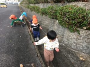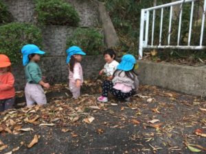 しばらくしてお散歩に出かけました。道中では通っていく車を見て「トラックだー!」と言ってみたり、お家を指差しして「茶色だ~。」と一緒に手を繋いでいるお友だちと、目に入る景色や色のお話を楽しみながら歩いていきました。近くの広場に着くと思いっきり走っていくお友だち。その先でどんぐりを見つけて「どんぐりころころみーっけたよ!」と喜んだり、たくさんの落ち葉を舞いあげて花火に見立てたりしていたお友だちを見て、他の子も真似をして大盛り上がりです。溝の中に落ちていたたくさんの落ち葉の上の大行進が始まり、カサカサという音を鳴らして楽しむ様子が見られました。風が少し強く寒いかな?と思って出掛けたお散歩ですが、帰って来た時にはみんな「あっつい!」と体がポカポカになったようでした。